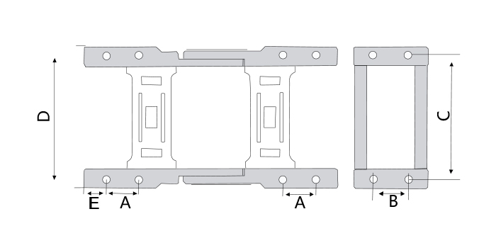 序列號 | 內(nèi)高 | 內(nèi)寬 | 外高 | 外寬 | 彎曲半徑(R) | 打開方式 | 節(jié)距 | A | B | C | D | E | 孔距 |
