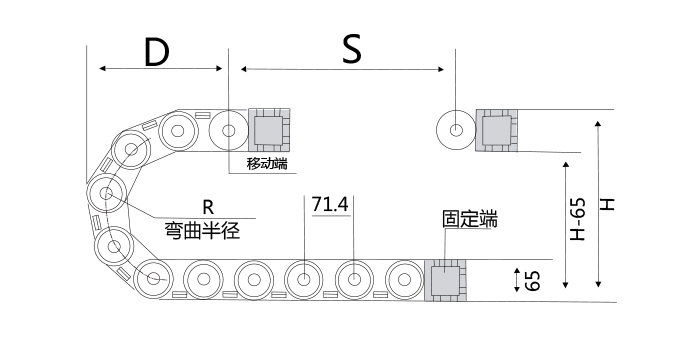 示意圖技術(shù)參數(shù)節(jié)距=71.4mm,每米節(jié)數(shù)=14,鏈長(zhǎng)=S/2+K,S=行程距離,K=π.R+"安全量"R7510125......