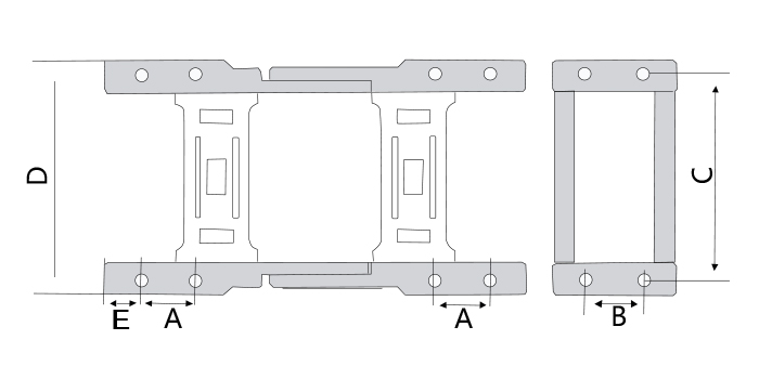 系列號(hào) | 內(nèi)高 | 內(nèi)寬 | 外高 | 外寬 | 彎曲半徑(R) | 打開方式 | 節(jié)距 | A | B | C | D | E | 孔距 |