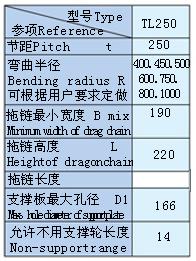 拖鏈型號(hào)TL250,支撐板Ⅲ型,彎曲半徑R=600,支撐板寬度Bi=400,拖鏈長(zhǎng)度L=12000