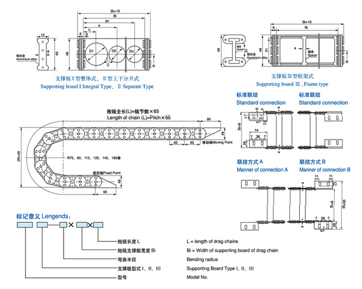 拖鏈型號(hào)TL65,支撐板Ⅲ型,彎曲半徑R=115,支撐板寬度Bi=200,拖鏈長(zhǎng)度L=6500